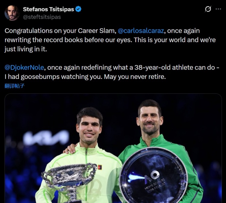 西西帕斯写道:“恭喜你完成全满贯,卡洛斯·阿尔卡拉斯!你再次在我们眼前改写了历史纪录。这是属于你的世界,我们只是生活在其中。”