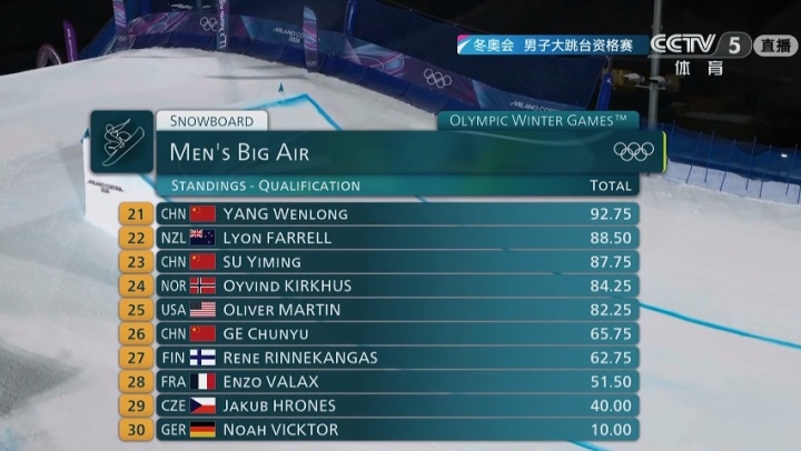 02月06日消息 冬奥会单板滑雪男子大跳台资格赛第二轮结束,苏翊鸣、杨文龙第二跳均拿出精彩表现,葛春宇两轮过后已经无缘晋级。