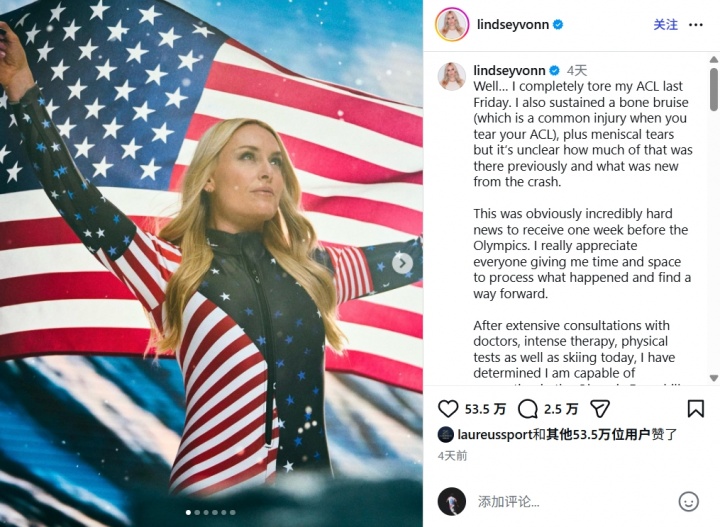 在上周林赛·沃恩刚刚遭遇了左膝前交叉韧带撕裂的重伤,但她仍然选择带伤坚持参加本届冬奥会。4天前,林赛·沃恩社媒发文,表示虽然自己受伤,但只要有一丝机会就不会放弃。