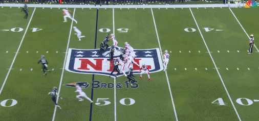 随后爱国者推进,海鹰的霍尔擒杀爱国者四分卫梅耶。迫使对方倒退了10码,最终爱国者选择弃踢。