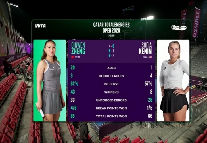 02月09日消息 WTA1000多哈站女单首轮比赛,时隔4个月复出的郑钦文三盘击败前澳网女单冠军肯宁,晋级第二轮。