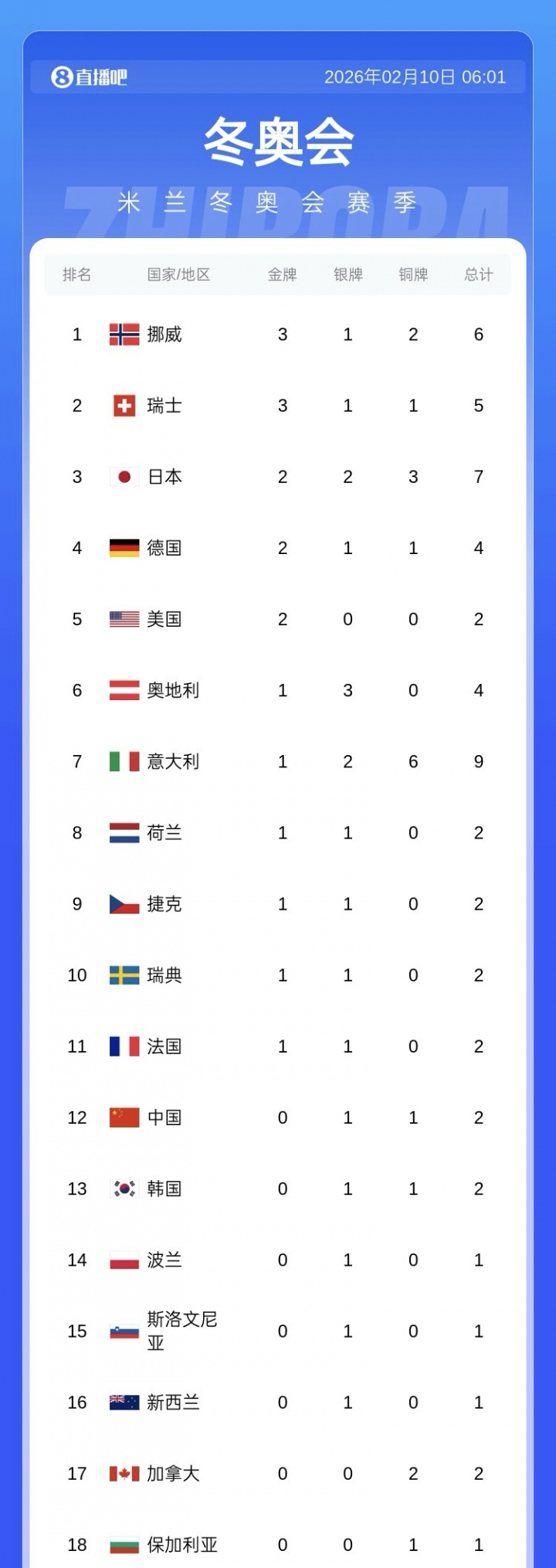 02月10日消息 米兰冬奥会第六个比赛日战罢,谷爱凌为中国队拿下一枚银牌,中国队以1银1铜升至奖牌榜第12位。瑞士队斩获2金1铜升至第二,日本队收获1金2铜升至第三,挪威队仍以3金1银2铜位居榜首。最新奖牌榜如下: