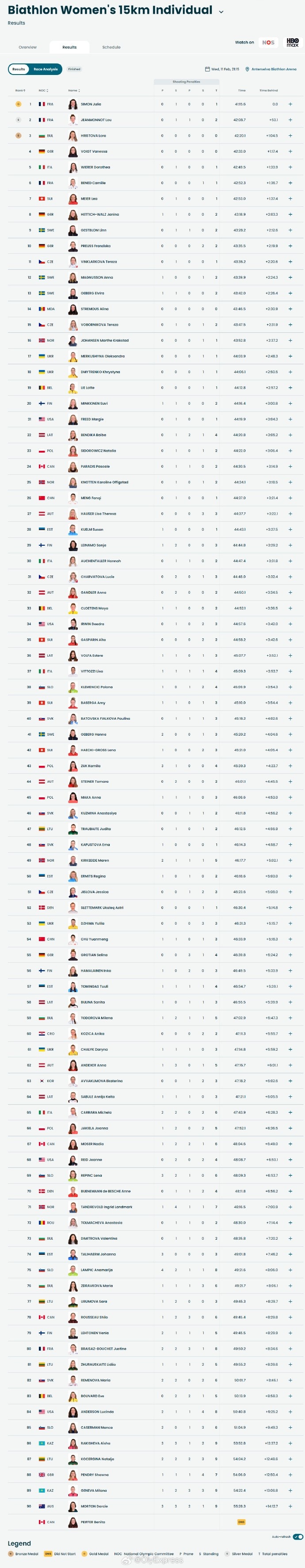 2月11日消息 冬奥会冬季两项女子15公里个人赛结束,法国西蒙和让蒙诺包揽金银牌,保加利亚赫里斯托娃获得铜牌。