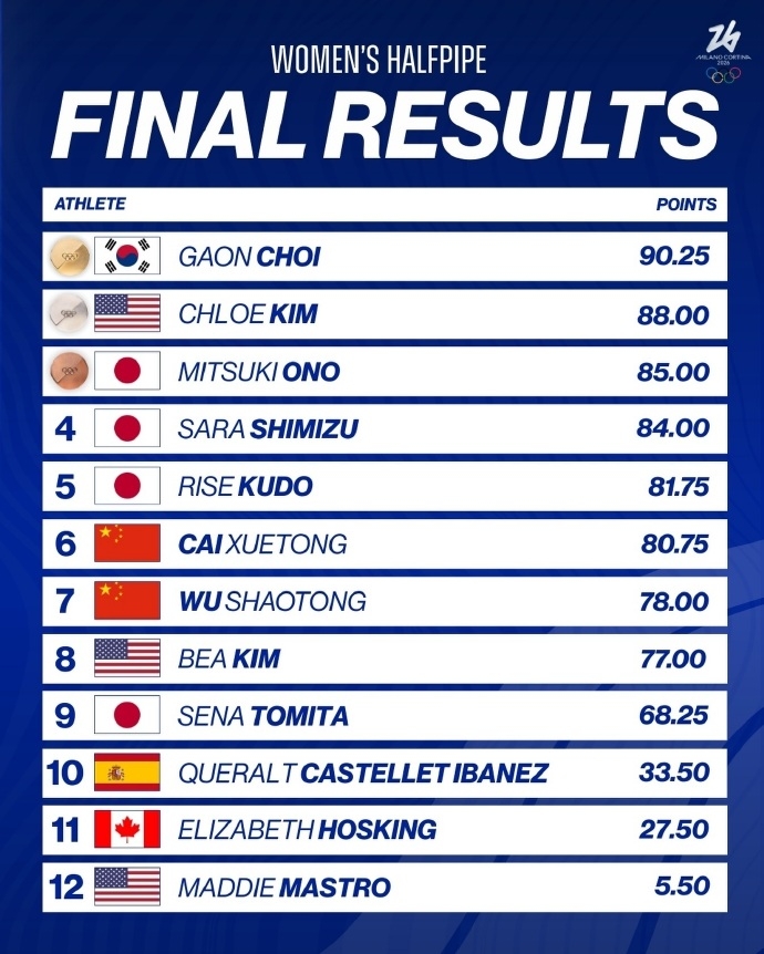 韩国名将崔佳恩第一滑严重摔倒,第三滑获得90.25分,夺得金牌。美国名将克洛伊·金以88.00分获亚军,日本选手小野光希85.00分获得铜牌。