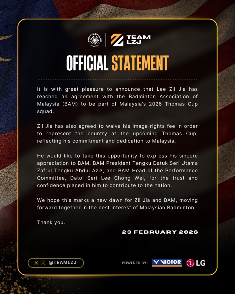 在此我们非常荣幸地宣布,李梓嘉和马来西亚羽毛球协会协商一致,将代表马来西亚羽毛球队出战2026年汤姆斯杯赛事。李梓嘉同意放弃肖像权费用,以促成代表马来西亚羽毛球队出战一事,此举也展现出他对马来西亚的承诺与奉献。