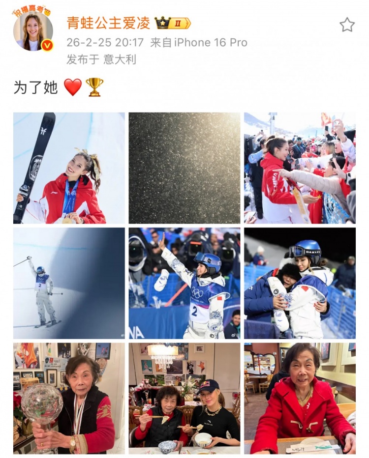谷爱凌晒出自己的奖牌照、比赛照以及和奶奶昔日的照片,并配文写道:“为了她❤️🏆”