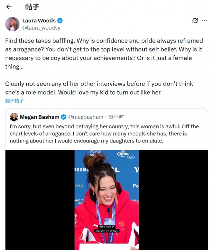 02月25日消息 近日美国作家兼记者Megan Basham在社媒转发了谷爱凌的采访视频,并批评谷爱凌傲慢,TNT著名女主持Laura Woods对这位记者的观点进行了反驳。