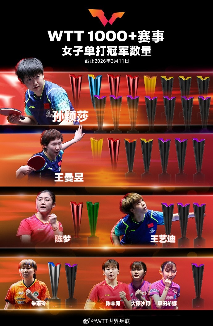 WTT1000+冠军榜:孙颖莎15冠领跑女单,王楚钦12冠,王曼昱7冠