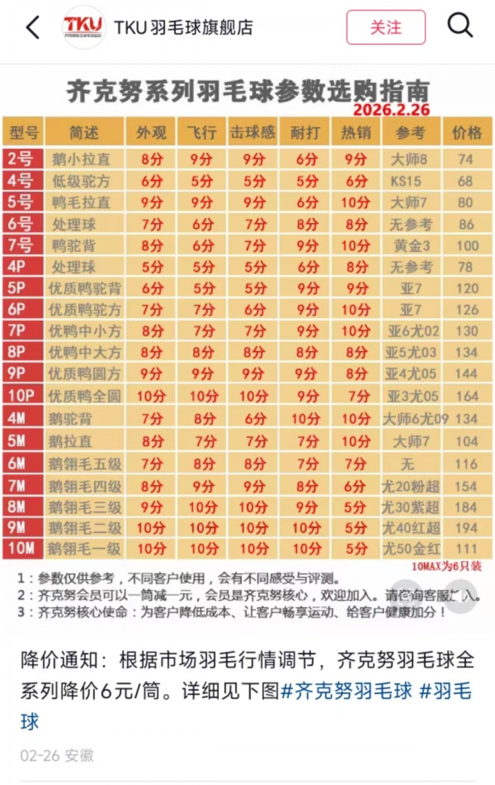 此外,2月24日,斯庄格运动互动旗舰店公告称决定对全系列羽毛球降价5元-10元/筒。2月26日,齐克努羽毛球旗舰店发布降价通知,齐克努羽毛球全系列降价6元/筒。