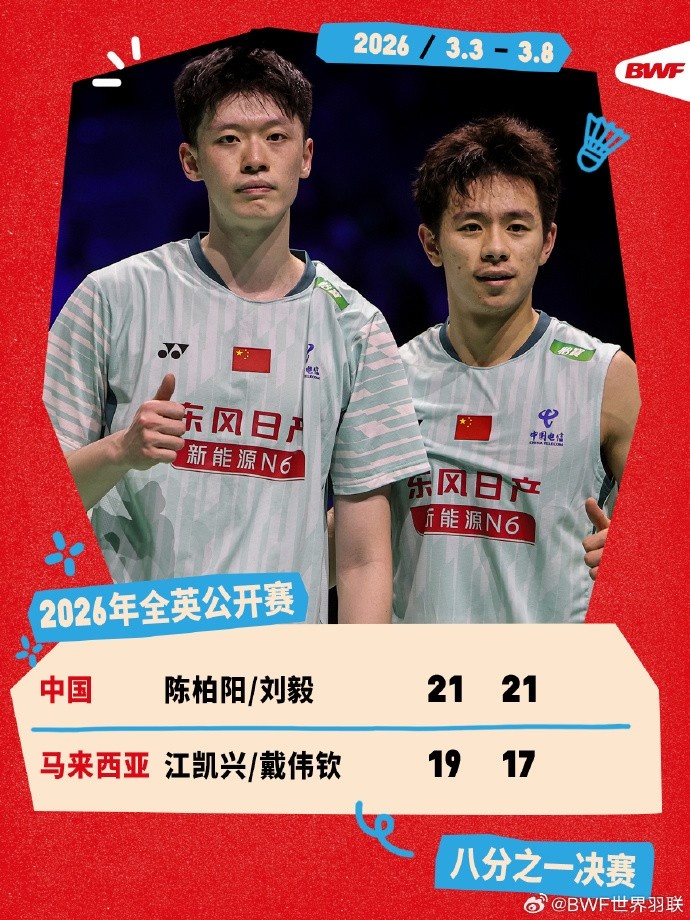 3月5日消息 全英羽毛球公开赛次轮,陈柏阳/刘毅2-0江凯兴/戴伟钦,跻身八强。