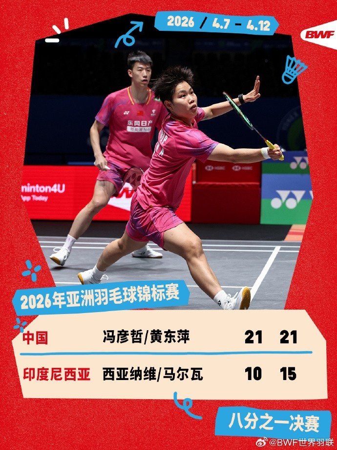 4月9日消息 羽毛球亚锦赛混双第二轮,冯彦哲/黄东萍2-0击败印尼组合西亚纳维/马尔瓦,晋级八强。