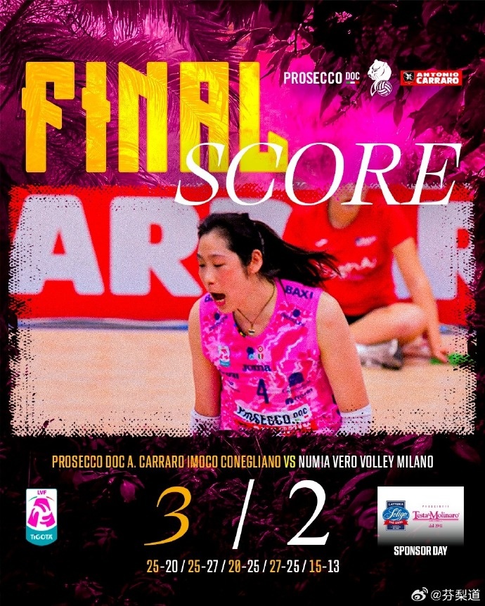 4月12日消息 意甲女排联赛决赛第一回合,科内利亚诺 3-2险胜米兰,大比分1-0领先。