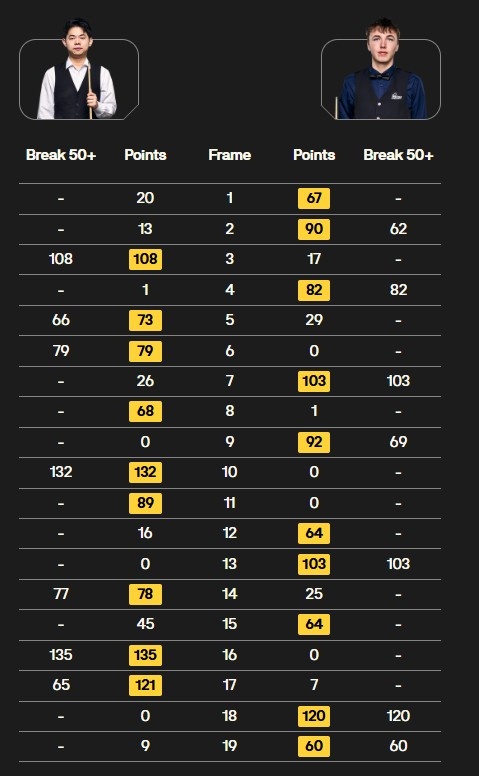 全场比赛袁思俊打出三杆破百(108、132、135)和两杆50+(66、79、77、65),本·默滕斯打出三杆破百(103、103、120)和四杆50+(62、82、69、60)。
