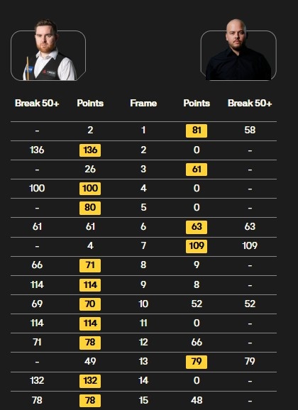 全场比赛,杰克·琼斯打出5杆破百,布雷切尔只打出1杆。
