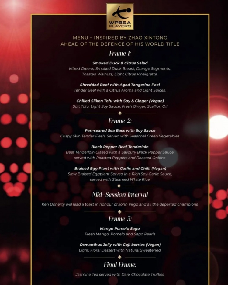中西合璧!赵心童作为卫冕冠军亲自设计了世界冠军晚宴的菜单