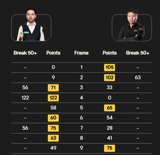 肖国栋打出一杆破百(122)和两杆50+(56、56),周跃龙在第二局打出单杆63分。