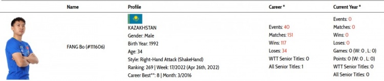 4月20日消息 WTT官网显示,34岁的前国乒球员方博以哈萨克斯坦球员身份注册WTT,有资格参加WTT赛事的比赛。