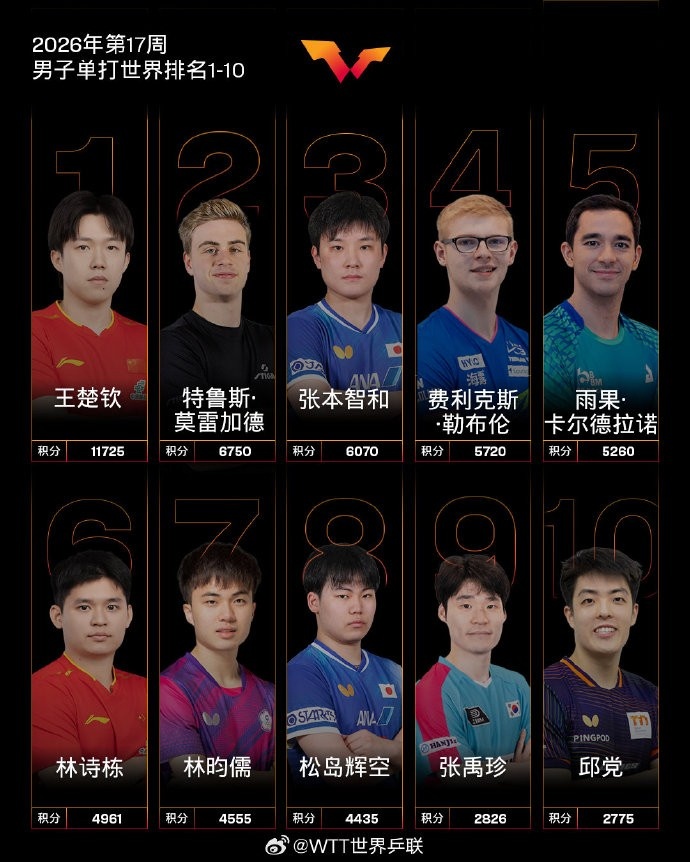 男单世界前10:1王楚钦、2莫雷加德、3张本智和、4小勒布伦、5雨果、6-林诗栋、7-林昀儒、8-松岛辉空、9张禹珍、10邱党。