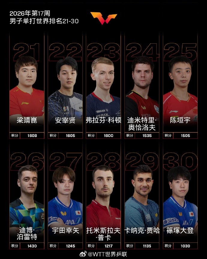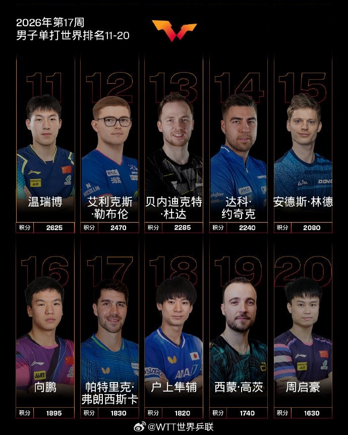 张本智和排名上升1个名次位列3;费利克斯·勒布伦排名上升2个名次位列4;向鹏排名上升1个名次位列16。