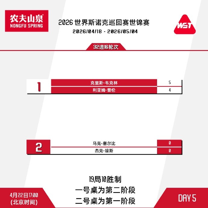 次日凌晨2点,尼尔·罗伯逊迎战庞俊旭;马克·塞尔比将与杰克·琼斯展开第二阶段较量。