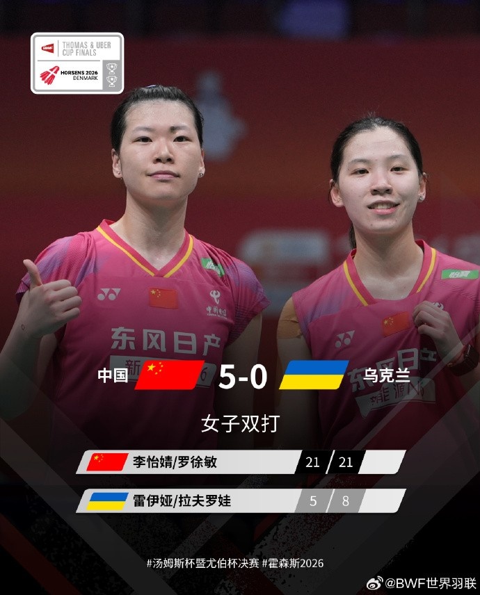4月24日消息 2026年汤尤杯小组赛,中国5-0大胜乌克兰,取得开门红。