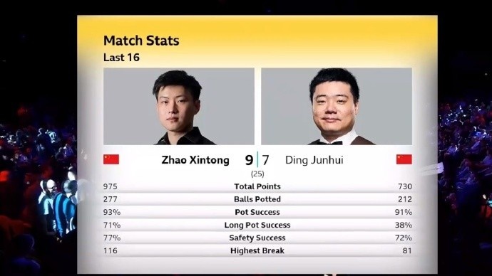 赵心童9-7丁俊晖数据:总分975-730、长台71%-38%、安全球77%-72%